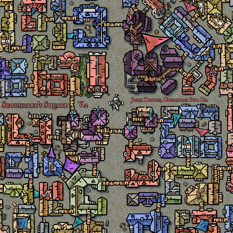 Scoundrel’s Square is embedded in the dark fringes of a larger metropolis and occupies a bloody and contentious crossroads. At the intersection of two major thoroughfares lay two large and rambling buildings, the headquarters for the major guilds of the city occupied with all things skulduggery; be that thievery, blackmail, secrets, or murder. Formerly allied with one another, the schism that rent the guild in two has further divided the surrounding streets, alleys, and rooftops.